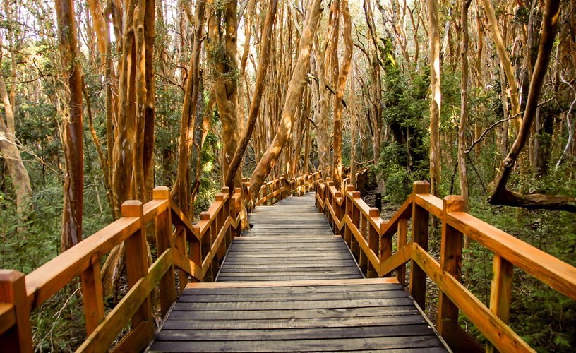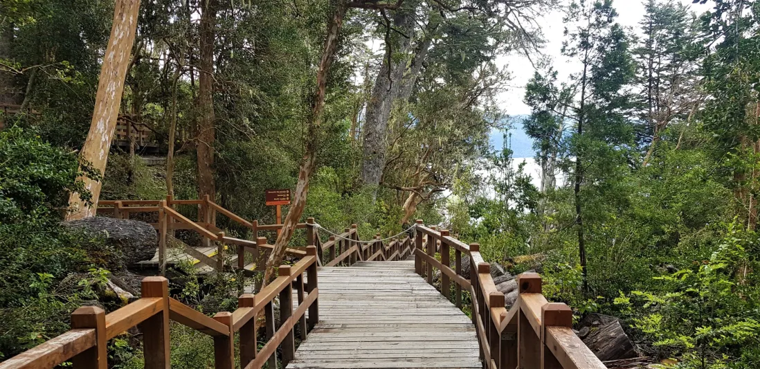 El protagonista es el arrayán (Luma apiculata), un árbol de corteza color canela, suave y fría al tacto, que aquí crece formando un ecosistema único. A lo largo del sendero, rodeado de estas especies centenarias, nuestros guías te contarán sobre la historia, la ecología y las leyendas que envuelven este paisaje patagónico.
